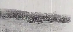 By 17 September the 5th Cavalry Division, which would lead the advance, was deployed north-west of Sarona, eight miles (13 km) from the front line, with the 4th Cavalry Division in orange groves to the east, ten miles (16 km) from the front, and the Australian Mounted Division in reserve near Ramleh and Ludd, 17 miles (27 km) from the front line.[10][11] All movement, restricted to the night hours, culminated in a general move forward on the eve of battle during the night of 18/19 September, when the Australian Mounted Division moved up to Sarona. The supplies for the three divisions concentrated in the rear in divisional trains, in massed horse-drawn transport and on endless strings of camels, clogging every road in the area.[12][13] One iron ration and two days' special emergency ration for each man, and 21 pounds (9.5 kg) of grain for each horse, was carried on the trooper's horse, with an additional day's grain for each horse, carried on the first-line transport limbered wagons.[14]
