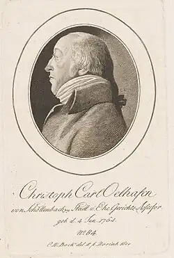Oelhafen was born in the manor of Eismannsberg near Altdorf belonging to the noble family of Oelhafen von Schöllenbach, his father Christoph Elias (1675–1736) was a lawyer married to Anna Maria née Gwandschneider. His younger siblings included the future Field Marshal of the Franconian Imperial Circle Georg Christoph Oelhafen von Schöllenbach (1710–1779) and the Court Councillor Jakob Christoph Oelhafen von Schöllenbach (1712–1749). Carl Christoph studied at Altdorf between 1724 and 1732 and then travelled across Europe as part of the academic grand tour. After returning he became an administrator in Velden and Hausseck in 1737. In 1748 he moved to Gräfenberg and in 1764 he became bailiff and judge at Sebaldiwald near Nuremberg. He took an interest in fruit and timber trees and was involved in establishing plantations and forestry across Franconia. He translated the works of Henry Louis Du Hamel du Monceau including De la Physique des Arbres (1758) into German[1][2] and also wrote on the wild trees of Franconia. He also translated René-Antoine Ferchault de Réaumur's work on the bees. He was admitted to the Leopoldina Academy in 1771 with the name Benedictus Curtius.[3][4]