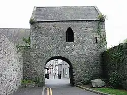 • Town Wall. Established by charter in 1326 by Edward II to the Bailiffs of Carlingford it allowed them to levy murage for its building. Not much remains however but the little that does has some externally splayed musket loops that would indicate the arrival of firearms to Ireland in the late 15th century. It is likely that the wall had an external ditch to strengthen its defences. Its purpose was to serve as a barrier to ensure that goods entering the town had to pass through a town gate (and hence could be taxed) but it also had the purpose of creating a boundary between Gael and Norman.