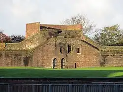 The West Walls are still needed to retain a former river cliff on the River Caldew and were not demolished. They have however been considerably altered over the years. Comparisons between old engravings and current archaeological evidence suggest the wall has been straightened.[7] Between the bridge and the castle, there were houses built up against the walls until 1952.[8] Other buildings erected against the walls have been largely removed so the walls are visible again. Remaining buildings have been listed because they incorporate wall fragments.[9]