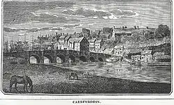 Carmarthen (UK: /kərˈmɑːrðən/, local: /kɑːr-/; Welsh: Caerfyrddin [kairˈvərðɪn], 'Merlin's fort' or possibly 'Sea-town fort') is the county town of Carmarthenshire and a community in Wales, lying on the River Towy 8 miles (13 km) north of its estuary in Carmarthen Bay.[3][4] At the 2021 census the community had a population of 14,636, and the built up area had a population of 16,455. It stands on the site of a Roman town, and has a claim to be the oldest town in Wales. In the middle ages it comprised twin settlements: Old Carmarthen around Carmarthen Priory and New Carmarthen around Carmarthen Castle. The two were merged into one borough in 1546.[5] It was the most populous borough in Wales in the 16th–18th centuries, described by William Camden as "chief citie of the country". It was overtaken in size by the mid-19th century, following the growth of settlements in the South Wales Coalfield.[5]