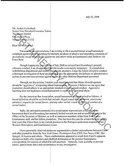 In a letter to the paper's editor, Cmdr. Jeffrey Gordon accused Carol Rosenberg of "multiple incidents of abusive and degrading comments of an explicitly sexual nature." Gordon, who deals primarily with the Guantanamo Bay, Cuba, prison, said in the letter that this was a "formal sexual harassment complaint" and asked the Herald for a "thorough investigation."