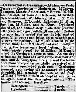 Carrington gained its one and only win in the competition in the first round in 1892–93, beating Dykehead 3–2 at home in the first preliminary; Dykehead protested that one of the corner flags was missing and that the pitch markings had been erased by heavy showers, but Carrington proved it had gone over the touchlines with lime and goal-lines with sawdust, and the referee gave evidence confirming the position, so the protest was dismissed.[17] Carrington lost 10–3 at Annbank in the second, although it startled the home side with a goal inside two minutes, against the wind and the slope.[18] Its last tie, in 1893–94, was a 6–1 defeat at Cambuslang, and in the wake of that defeat Carrington scratched to the 3rd Lanark in the Glasgow Cup.[19]