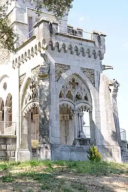 The project was conceived and executed in 1915, by Swiss architect (and later naturalized Portuguese) Ernesto Korrodi, under contract with João José Ferreira Rego, then married to a Brazilian lady named Francisca Peixoto Rego.[1][2] The castle's name came from the patroness, whose diminutive form (Chica) was the origin of its popular name; Francisca Peixoto Rego was active in the import of many of the arboreal plant species from Brazil, used to landscape the property.[1][2] Korrodi's project was based on his idealized concept of the Habitação Nobre de Província (Provincial Nobles' House), a typology that the architect was dedicated to at the beginning of the 20th century, and which "...evoked, across diverse inspirational sources, one of the art of the Middle Ages and one from a determined social lifestyle, of the triumphal burgers of the 19th century, while grounded in tradition and progress..."[2][3]