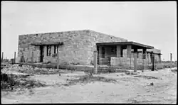 During Castlecrag's early years, houses were either designed by Griffin and Mahony Griffin (fifteen were built) or approved by them.[29] The houses were characterised by concrete block and stone found at the site, material which matched the natural surroundings (three houses were built using Knitlock only).[30] The use of these materials facilitated the quick and affordable construction of the houses.[31] The Griffins' designs boasted innovations such as the kitchens' pass-through pantries and twin sinks, the close-to ground floor levels and the picture window.[32]