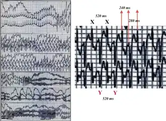 In those with CPVT, catecholamine release can lead to an abnormal heart rhythm or arrhythmia known as ventricular tachycardia.[4] The ventricular tachycardia may take a characteristic form known as bidirectional ventricular tachycardia. This form of ventricular tachycardia occurs relatively infrequently, but if seen is suggestive of an underlying diagnosis of CPVT or the related condition Andersen-Tawil syndrome.[8][9] These ventricular arrhythmias in some cases terminate by themselves, causing a blackout from which the person then recovers. However, if the abnormal heart rhythm continues, it can degenerate into a more dangerous arrhythmia known as ventricular fibrillation causing a cardiac arrest and, if untreated, sudden death.[10]