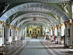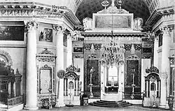The cathedral walls were decorated with alabaster under white marble and with engaged columns, stucco on biblical subjects, and 23 paintings on religious motives. The paintings were created by icon painter Rukavitsyn and pasted on the walls.[40] The dome was painted using an outdoor technique.[41][42] The main altar of the cathedral was dedicated to the Theotokos of Kursk. There was also a chapel on the southern side dedicated to St. Mitrofany of Voronezh and Alexander Nevsky, and a chapel on the northern side dedicated to Tikhon of Zadonsk and Seraphim of Sarov. On the southern side of the cathedral, there was also a chapel dedicated to St. Nicholas of Myra.[43] Above the refectory was originally a church with three priests. It was named for the Presentation of the Lord, St. Nicholas and St. Anthony and Theodosius of Pechersk. This church was abolished in 1837. The iconostases of the side chapels were made of gilded wood, and the one-tier iconostasis of the main altar had an unusual artistic solution — it was cast in cast iron and gilded. All the icons on the main iconostasis were painted on canvas by the St. Petersburg artist Borghi[44] for 15,000 rubles.[41][39] The king's gate, north and south gates were also made of cast iron and gilded. To the left of the iconostasis of the main altar, high enough there was a large silver casket for the Theotokos of Kursk.[42] It had a cast-iron with gilded shade, to which several stone steps led. In front of the icon hung an expensive velvet veil embroidered with gold, silver, and pearls.[8]