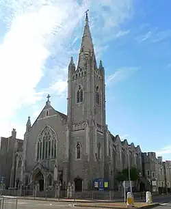 The church and its associated buildings stand on a corner site. The church itself is entered from Pevensey Road and faces southeastwards; its side façade faces southwest on Susans Road. Next to it on this road is the Sunday school and church hall, which also has a northwest elevation along Langney Road.[44] The church entrance is in a canted buttressed porch next to the tower, which stands at the southeast corner. There are two pairs of lancet windows in the porch, each with trefoils above.[44] A wide seven-light lancet window with tracery and trefoils is above this. The double doorway in the porch has a carving of a verse from Psalm 100: enter into his gates with thanksgiving and into his courts with praise. The Susans Road façade is of five bays, each with a gable and arched windows at the upper (gallery) level. There is another porch at the northeast corner.[44]