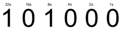 A six-bit word containing the binary encoded representation of decimal value 40. Most modern CPUs employ word sizes that are a power of two, for example 8, 16, 32 or 64 bits.