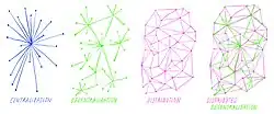 Diagrams of systems in various degrees of centralisation. From left to right: centralisation, decentralisation, distribution, and distributed decentralisation.