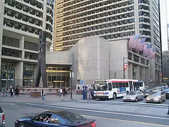 Centre Square has been the home to numerous works of contemporary art. Until the company left in the mid-1980s, Arco Chemical Co., whose headquarters was in Centre Square, had a large collection of contemporary art displayed throughout the complex.[8][12] Philadelphia has a percent for art program, which requires that a percentage of construction costs be allocated for art.[13] A fan and collector of contemporary art, developer Jack Wolgin had three pieces commissioned to fulfill the ordinance.[3] The most famous piece is Claes Oldenburg's 45 feet (14 m) Cor-Ten and stainless steel sculpture, Clothespin.[3][14] Located atop the subway entrance in the plaza in front of the building, Centre Square is best known because of Clothespin and is often called the Clothespin Building.[15] Wolgin's lawyer said the lead tenant, the First Pennsylvania Bank, had requested a conventional statue of a general on a horse, but Wolgin said, "No. You're getting a clothespin."[3] A second sculpture was also commissioned. The steel sculpture Milord la Chamarre by Jean Dubuffet was placed in the atrium. In the mid-1980s the interior was renovated and Milord la Chamarre was moved outside on Market Street. Also commissioned were eight banners by Alexander Calder. The banners, ranging from 18 feet (5.5 m) to 28 feet (8.5 m), were hung from the atrium ceiling and had colorful sun, flower, moon and night designs. The dyed cotton and silk banners, the only banners Calder ever designed, were removed during the renovations in the 1980s and were subsequently lost. After pressure from the Philadelphia Redevelopment Authority art program to search for the banners, they were discovered in a storeroom in the early 2000s. In 2009 some of the banners were put on temporary display at the Free Library of Philadelphia while the Redevelopment Authority works to find a place to have them displayed permanently.[3][16]