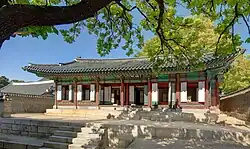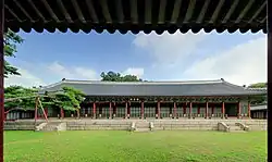 A single-story hall where the king received council and conducted politics.[92] It is a designated Treasure.[82] Spirit tablets were also possibly stored here.[92] It was built in 1405 and originally named Jogyecheong (조계청; 朝啓廳; Chogyech'ŏng). It received its current name in 1461. After being destroyed in 1592 during the Imjin War, it was rebuilt in 1608. It was destroyed in 1623 during the Injo coup and rebuilt in 1647, using materials recycled from a building called Gwangjeongjeon in In'gyŏnggung. It has since become the oldest extant building in the palace.[93] It is the only remaining Joseon palace building with blue roof tiles, which were then considered luxurious and difficult to make.[94][95] During the colonial period, the building was opened to the public, and glass put in its windows. The building was restored to its pre-colonial appearance in 1996.[95]