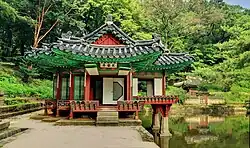 A royal library building that went by a number of names, including "Naegak" (내각; 內閣) and "Kyujanggak". The latter name has been applied to several different buildings, depending on which held the royal library's collection at the time.[97] This building was completed on the 10th day, 3rd month of 1781,[31] and the royal library was moved from Juhamnu to Imunwon.[97]