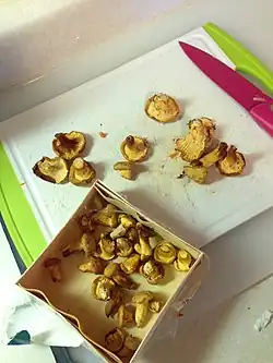 Chanterelles are also well-suited for drying, and tend to maintain their aroma and consistency quite well.[11] Some chefs profess that reconstituted chanterelles are actually superior in flavor to fresh ones, though they lose in texture whatever they gain in flavor by becoming more chewy after being preserved by drying.[12] Dried chanterelles can also be crushed into flour and used in seasoning in soups or sauces. Chanterelles are also suitable for freezing, though older frozen chanterelles can often develop a slightly bitter taste after thawing.[11]