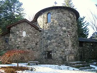 The chapel is a two-story roughly rectangular stone structure, oriented east-west, with a gabled roof. The stone used in its construction was locally gathered, and integrates a number of unusual features, including a paving stone from the Cambridge sewer system, a 16th-century madonna and child figure executed in Carrara marble, and ecclesiastical wood carvings. It has a gracefully curved apse, and a rose window in the gable at the western end.[2]