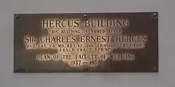 The Hercus Building, part of the University of Otago Dunedin School of Medicine, on the corner of Great King and Hanover Streets, is named for Hercus.[7]