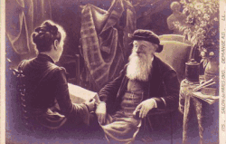 In 1893 Gratia became very ill, and his family took him to Rouen, Normandy. He lived in Normandy for fifteen months, during which time he received no commissions and began to run through his small savings. He had two very young sons to support. He returned to Paris, where Raymond Poincaré, the Minister of Fine Arts, paid 2,000 francs to buy La Liseuse for the State. Soon after the Nancy Museum paid 1,500 francs for his portrait of his first wife. In Paris Gratia ran an employment office on the Rue Lamartine for seven years. In 1896, when aged 81, Gratia made one of his most impressive portraits, Thinking Monk a self-portrait. He no longer had a studio, but painted it in his small apartment on Avenue Laumière in Buttes-Chaumont.[3]