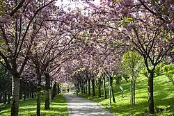 Parc de Sceaux, located in a suburb of Paris, has two orchards of cherry trees, one for white cherry blossoms (Prunus avium) and one for pink cherry blossoms (Prunus serrulata).[40] The orchards combined make up 264 trees,[41] which attract many visitors when they bloom in early April.[42] Additional plantings are present in the capital along the Seine River, near Notre-Dame de Paris, and in the Bastille area.[43]