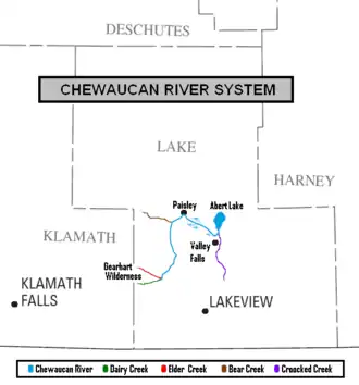The Chewaucan flows for 53 miles (85 km) through Lake County, Oregon.[4] The sources of the Chewaucan are Elder Creek and Dairy Creek. Both have their headwaters in the east drainage of Gearhart Mountain Wilderness. The Chewaucan is the result of their merger east of the Gearhart Mountain Wilderness near Dairy Point. From there, the Chewaucan flows north through the Fremont-Winema National Forests, where waters from Ben Young Creek, Coffeepot Creek, Antelope Springs, Corral Creek, Dog Creek, Sage Hen Creek, Bear Creek, and Mill Creek flow into it before the river passes out of the forest near Paisley.[6]