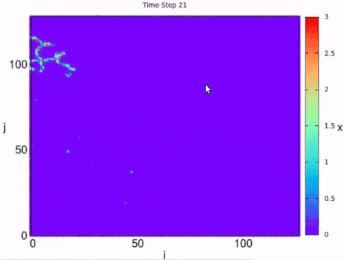 Analogous to the previous example, it's possible create a set of coupling neurons over a 2-D lattice, in this case the evolution of action potentials is given by: