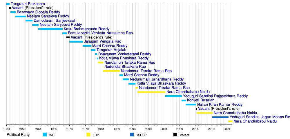 Since 1953, there have been 19 chief ministers with the majority of them belonging to the Indian National Congress (INC). In 1953, Tanguturi Prakasam from the INC became the first chief minister of the Andhra State. In 1956, Neelam Sanjeeva Reddy from the INC became the first chief minister of Andhra Pradesh post the reorganisation of Indian states. The longest-serving chief minister was N. Chandrababu Naidu from the Telugu Desam Party (TDP), who held the office for over thirteen years across multiple terms, while N. Bhaskara Rao from the TDP had the shortest tenure of 31 days. N. Chandrababu Naidu was also the first chief minister of the state post the bifurcation of Telangana in 2014. Later Neelam Sanjeeva Reddy went on to become the President of India, while P. V. Narasimha Rao, also from the INC and previously the fourth chief minister of Andhra Pradesh went on to serve as the Prime Minister of India. Notably, N. T. Rama Rao from the TDP was the first non-INC chief minister of the state. There have been three instances of President's rule in Andhra Pradesh, most recently in 2014.