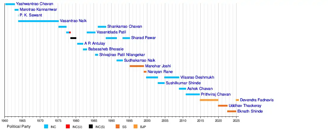 Maharashtra was formed by dissolution of Bombay State and Hyderabad State on 1 May 1960.[3] Yashwantrao Chavan, who was serving as the third CM of Bombay State since 1956, became the first CM of Maharashtra. He belonged to the Indian National Congress and held the office until the 1962 Assembly elections. Marotrao Kannamwar succeeded him and was the only CM to die while in office.[4][5] Vasantrao Naik, who was in office from December 1963 to February 1975 for more than 11 years, has by far been the longest serving CM. He also was the first and only CM to complete his full term of five years (1967-1972) till Devendra Fadnavis matched it (2014-2019). With the exceptions of Manohar Joshi (SS), Narayan Rane (SS), Devendra Fadnavis (BJP), Uddhav Thackeray (SS) and Eknath Shinde (SS), all other CMs have been from the Congress or its breakaway parties.[6][7][8]