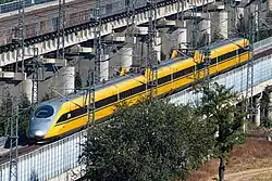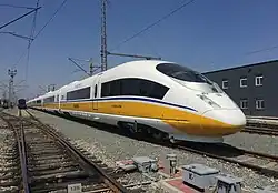 The CRH380BJ-0301 (initially CIT400B) is a 380 km/h (236 mph) CIT train, co-manufactured by the CNR Tangshan and CNR Changchun factories.[8] The design is based on CNR's CRH380CL trainset, with a formation of 6M2T, a designed top speed of 500 km/h (311 mph), and a top operating speed of 400 km/h (249 mph).