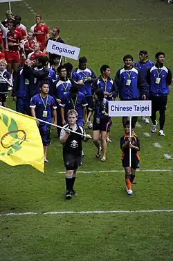 The Chinese Taipei national rugby sevens team is a minor national sevens side. They have competed in the Hong Kong Sevens since the 1980s.[1] In 1989, veteran rugby commentator Bill McLaren mentions them in an article on the Hong Kong Sevens, saying that their team had two Chi-Mings, a Yen-Ching, and a Chijen-Shuen, and that he was grateful that he did not have to broadcast all the names, as he had trouble remembering them.[2]
