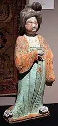 Cizang (慈藏), a Silla monk, studied Vinaya in China and when he returned to Silla, he promoted Dharma in 643.[9] Cizang also contributed to the change of Silla's imperial or official dress for the customs of the Tang, which also marked the beginning of Chinese clothing rituals in Silla.[9] During the reign of Queen Jindeok, Kim Chunchu adopted the Tang dynasty dress and encouraged the Silla kingdom to adopt Chinese administrative practices.[10] The danryeong was thus introduced from the Tang dynasty by Kim Chunchu in the second year of Queen Jingdeok's rule.[11]