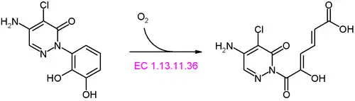 - 5-amino-4-chloro-2-(2,3-dihydroxyphenyl)-3(2H)-pyridazinone + O2 5-amino-4-chloro-2-(2-hydroxymuconoyl)-3(2H)-pyridazinone