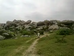 Padiyendhal is a rock art site in a small cave located backside of Andimalai. Actually the name "Padiyendhal" refers to the nearby village. Local people call this cave as "Irulan Kal". On the roof of the cave, ancient paintings of horse, bow and arrow structures are found. The symbols found in the roof and the side walls of the cave are similar to that of found in Indus valley civilization.[4]