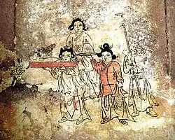 The earliest visual depictions of hanbok can be traced back to the Three Kingdoms of Korea period (57 BCE to 668 CE).[65][66][67][68] The origin of ancient hanbok can be found in the ancient clothing of what is now today's Northern Korea and Manchuria.[69] Some hypothesize that the hanbok of antiquity can trace its origin to nomadic clothing of the Eurasian Steppes (Scythian clothing), spanning across Siberia from western Asia to Northeast Asia, interconnected by the Steppe Route.[70][71][72] Reflecting its nomadic origins in western and northern Asia, ancient hanbok shared structural similarities with hobok type clothing of the nomadic cultures in East Asia, designed to facilitate horse-riding and ease of movement,[23][73][74] such as the use of trousers and jacket for male clothing and the use of left closure in its jacket.[75] However, although the ancient hanbok reflects some similarity with the Scythian clothing, numerous differences between the two types of clothing have also been observed which led associated professor Youngsoo Chang from the Department of Cultural Properties in Gyeongju University in 2020 to suggest that the theory about Scythian clothing being the archetype of the ancient hanbok, a theory accepted as common knowledge in Korean academia, having to be revised.[75] It is also important to note that the Goguryeo tomb murals were primarily painted in two geographical regions: Ji'an (集安) and Pyongyang.[76]: 15  The former is the second capital of Goguryeo while the latter is the third capital of Goguryeo from the mid-fourth to the mid-seventh centuries.[76]: 15  While the mural paintings found in Ji'an typically shows the characteristics of Goguryeo people in terms of their customs and morals; those from Pyeongyang typically show the cultural influences of the Han dynasty, including Chinese-style clothing, as the Han dynasty had governed this geographical region for approximately 400 years.[76]: 15