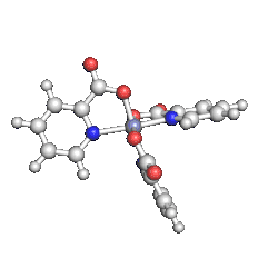Chromium(III) picolinate has a distorted octahedral geometry and is isostructural to cobalt (III) and manganese (III) counterparts.[11][12] Chromium(III) is a hard lewis acid and as such has high affinity to the carboxylate oxygen and medium affinity to the pyridine nitrogen of picolinate.[11][13] Each picolinate ligand acts as a bidentate chelating agent and neutralizes the +3 charge of Cr3+. Evidence that the Cr3+ center coordinates to the pyridine nitrogen comes from a shift in the IR spectra of a C=N vibration at 1602.4 cm−1 for free picolinic acid to 1565.9 cm−1 for chromium(III) picolinate.[11] The bond length between Cr3+ and the nitrogen atom of the pyridine ring on picolinate ranges from 2.047 to 2.048 Å.[12] The picolinate ligand coordinates to Cr3+ only when deprotonated and this is evident by the disappearance of IR bands ranging from 2400 to 2800 cm−1 (centered at 2500 cm−1) and 1443 cm−1, corresponding to the O-H stretching and bending, respectively, on the carboxyl functional group.[10][11] Furthermore, this IR shift also indicates that only one oxygen atom from the carboxylate of picolinate coordinates to the Cr3+ center.[10][11][13] The Cr-O bond length ranges from 1.949 to 1.957 Å.[12] The crystal structure has only been recently described in 2013.[13] Water does not coordinate to the Cr3+ center and is instead thought to hydrogen bond between other Cr(Pic)3 complexes to form a network of Cr(Pic)3 complexes.[13]