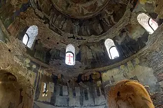 The building, a cylindrical domed structure built on a square base, is famous for the 12th-, 13th-, and 14th-century frescoes inside the central dome. Three layers of frescoes have been discovered, the earliest dating back to the 10th century. Frescoes of 22 prophets over 2 metres tall crown the dome. Painted over during the Ottoman period, when the building was used as a mosque, these frescoes were only uncovered and restored in the 20th century.[2]