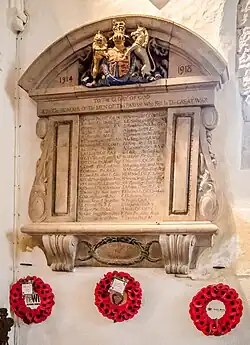 There are three large war memorials inside the church. The World War One marble tablet memorial, lists 48 men from Stoke Poges who died.[46] The memorial was executed by Sir Ernest George and Mr Basil Gotto, a sculptor.[47] It is located in the chancel. The World War Two stained glass window memorial lists 8 men from Stoke Poges who died. The memorial was designed by Lawrence Lee and executed by Christopher Wallis.[48] It is at the west end of the nave. Also incorporated in the window are the coat of arms of the Diocese of Oxford and an ancient restored image of a person on a hobby horse blowing through a trumpet, known as the 'bicycle window'.[28] Men who had attended Stoke House School in Stoke Poges and later died in the South Africa War (1901–1903) are remembered by a stained glass window which depicts St Michael and St George.[49] The window was designed by Louis Davis.[50] It is located in the north aisle.