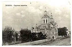 The first reliable account of the Tyumen Church of the Saviour comes from the 1624 Dozornaya book, which describes a wooden, "cold" All-Merciful Church in a posad.[5] It was located on the Market (Guest) square, near the walls of the Tyumen Kremlin.[6] Local historian Aleksandr Ivanenko assumes that it was named after the Spasskaya gate tower of the Kremlin,[3] from which started the Large Spasskaya Street (now the Republic Street).[7] According to Ivanenko, the church was located a bit to the left of a house at the Republic Street; that place is now swamped by the Tura River.[3]