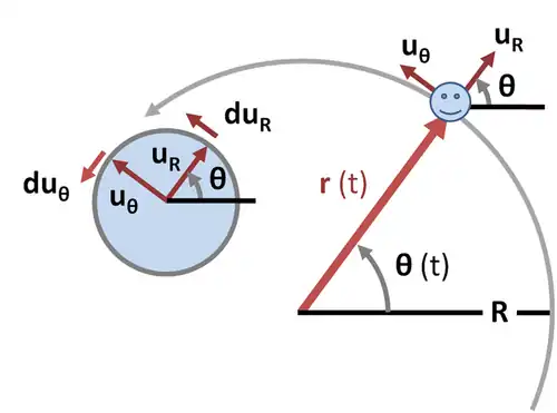 During circular motion, the body moves on a curve that can be described in the polar coordinate system as a fixed distance R from the center of the orbit taken as the origin, oriented at an angle θ(t) from some reference direction. See Figure 4. The displacement vector is the radial vector from the origin to the particle location: where is the unit vector parallel to the radius vector at time t and pointing away from the origin. It is convenient to introduce the unit vector orthogonal to as well, namely . It is customary to orient to point in the direction of travel along the orbit.