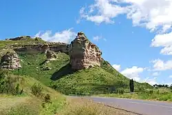Clarens is part of the scenic Highlands Route and is surrounded by mountains. The Rooiberge is the range encompassing the village, while further towards the southeast are the Maluti mountains in shades of purple and blue. All around are the sandstone cliffs with their multi-coloured layers - these horizontal strata are a characteristic feature of the area. Many homes in the Clarens Valley are made from or clad in sandstone.