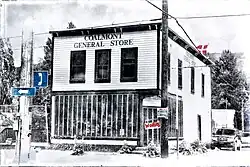 The former original general store occupies the Parrish Ave/Front St corner. Across the street, the former Coalmont Emporium building still stood in 2012.[116] All that now remains is the concrete island of the gas bar, which was out front.[117]