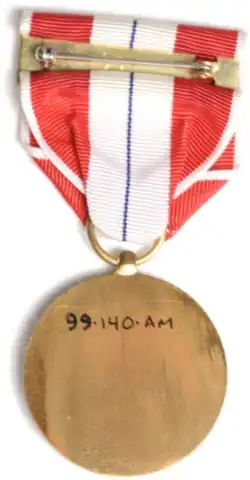 The ribbon consists of two broad red bands separated by a white band, with a very narrow blue stripe in the center of the white band and narrow white stripes on the ribbon′s left and right edges. Because all six medals authorized in 1988 are identical, only the ribbons authorized in 1945 that the medals are suspended from distinguish the medals from one another.