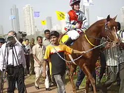 A yellow neck strap on a racehorse.A simple narrow leather strap buckled around a horse's neck to give security to jockeys and other riders. Another form of neck strap (or rope) is the one used by cowboys when roping. This style is shorter and placed closer to the horse's head with the lariat passing through in order to keep the horse facing the calf after it has been roped. It also refers to the part of a martingale, which buckles around the horse's neck. A loose neck collar is also used on harness racing horses when the reins are passed through.