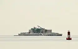 CBS spent approximately $500,000 to construct the transmitter building with emergency housing for ten workers, and the 410-foot (125 m) broadcast tower. The station contained a 50,000-watt transmitter housed in a 75-square-foot (7.0 m2) copper-walled building. There also was a 5,000-watt transmitter unit for emergency use. Electric power was supplied through two submarine cables, which were connected to separate power plants to prevent interruption of service. Emergency generators were installed on the island for protection against power failure.[3] The men who operated the station lived within a grounded metal shell under which were living quarters for engineers, workshops, electrical units that supplied tube voltages, and the backup generator.[4] The transmitter remained in operation until 1963, when it became obsolete, and the station was moved to nearby High Island.