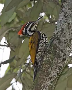 The common flameback (Dinopium javanense), also referred to as the common goldenback, is a small (28–30 cm), three-toed woodpecker in the family Picidae, found throughout South and Southeast Asia.[2]