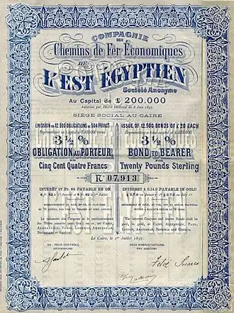 ![]() Stock exchange certificate for Compagnie des chemins de fer économiques de l'Est égyptien, 1 July 1897 | |