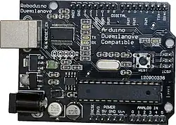 | DuinoBot v1.x[79] | RobotGroup Argentina[80] | ATmega32U4 | 16 MHz | Arduino fully compatible board, with integrated power supply and controllers designed for robotics. Compatible as well with the system "Multiplo" | ||||||||||||||