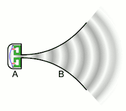 In 1924 C. R. Hanna and J. Slepian[1] were the first to discuss the benefits of using a large radiating diaphragm with a horn of smaller throat area as a means of increasing the efficiency of horn loudspeaker drivers. They correctly surmised that this arrangement results in a significant increase in the radiation resistance (and therefore increased efficiency), because the loading mismatch between the vibrating transducer surface and air is largely corrected, thus allowing for much better energy transfer. In the Hanna and Slepian proposal the compression cavity is directly connected to the throat of the horn.