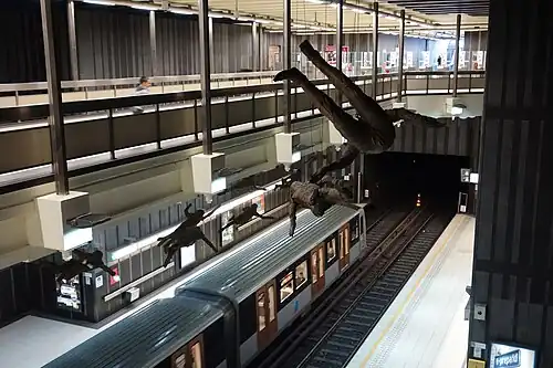 Under the name 16 X Icarus, sixteen apparently flying dolls made of plaster and bronze are suspended from the ceiling at different heights in the station hall and above the platforms. The artwork is by Paul Van Hoeydonck.[3][4]