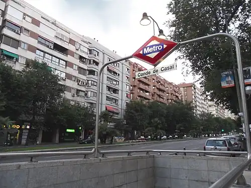 Conde de Casal [ˈkonde ðe kaˈsal] is a station on Line 6 of the Madrid Metro, located under the Plaza del Conde de Casal (which takes its name from Manuel Escrivá de Romaní, conde de Casal, 20th-century politician).[1] It is located in fare Zone A.[2]