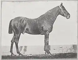 Conquérant came from crosses between two breeds of horse, the Norfolk Trotter and the Thoroughbred.[25][26][27] The Norfolk Trotter can be traced back to both paternal and maternal origins.[28] His sire, Kapirat, and his dam, Elisa, both came from crosses between Norfolk Trotters and Thoroughbreds.[25] This type of crossing, which resulted from the introduction of the Trotter Norfolk in France,[29] was common in the 19th century to produce the best speed trotters.[30]