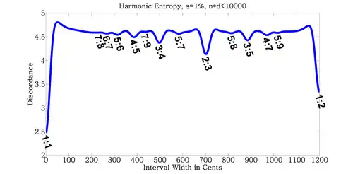 - Frequency ratios: When harmonic timbres are played in one of the just intonations (or a sufficiently close approximation thereof), ratios of higher simple numbers are more dissonant than lower ones.[31] However, the farther the timbre departs from the harmonic series, and/or the farther than the tuning departs from a Just Intonation, the less the "frequency ratio" rule applies.[32]